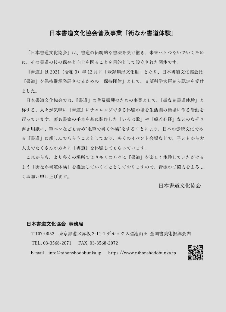 日本書道文化協会が実施している「街なか書道体験」は、これまで多くの団体等により実施されてきており、各種イベント等の来場者が老若男女を問わず、気軽に立ち寄り毛筆体験を行っていただく機会を提供していただいております。