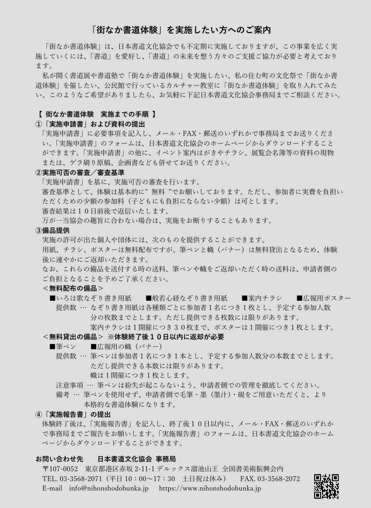 このたび、「街なか書道体験」の内容や実施方法などを記載した実施案内書と作成するととともに、申請書や実施報告書の様式を作成いたしました。