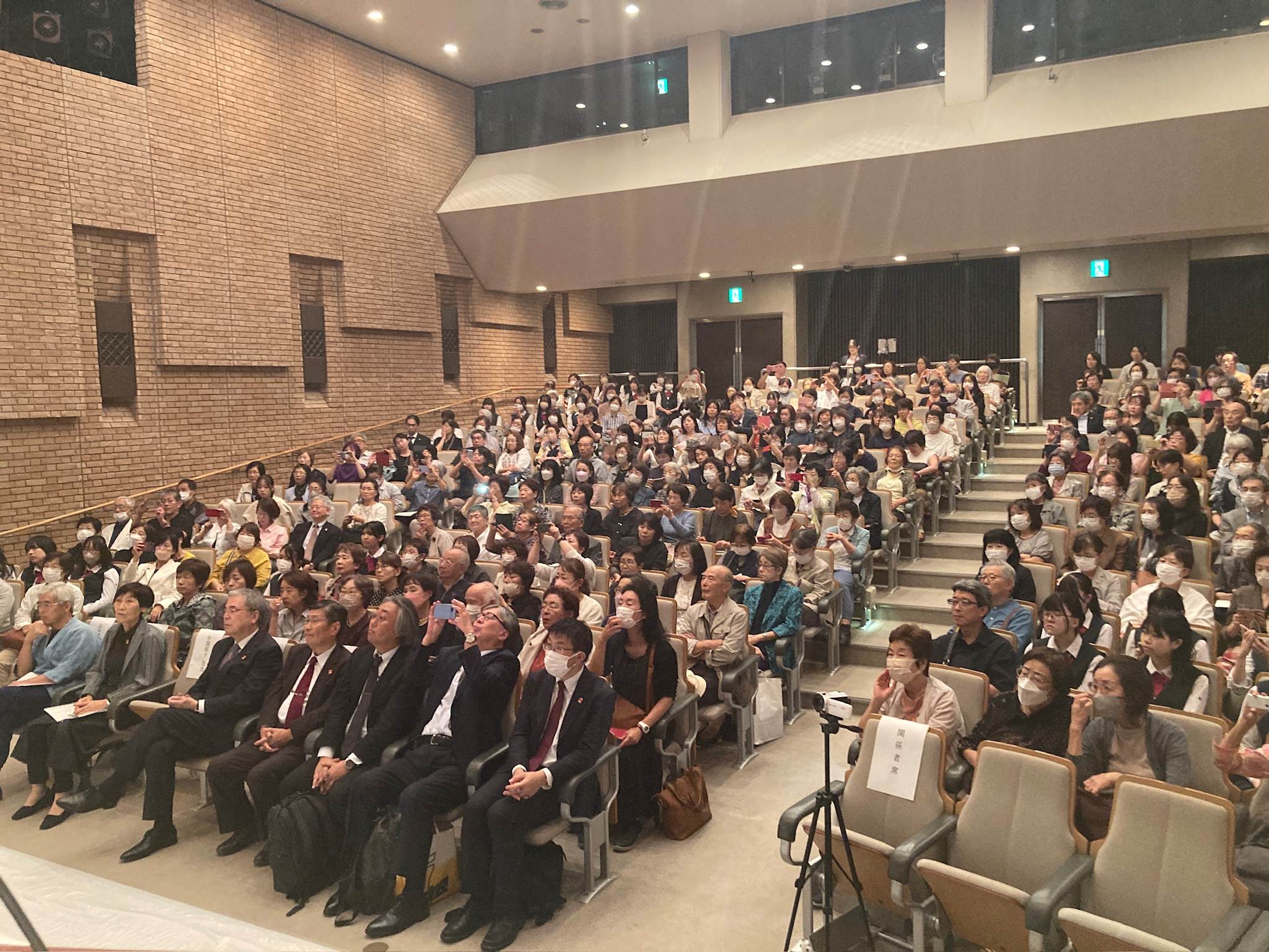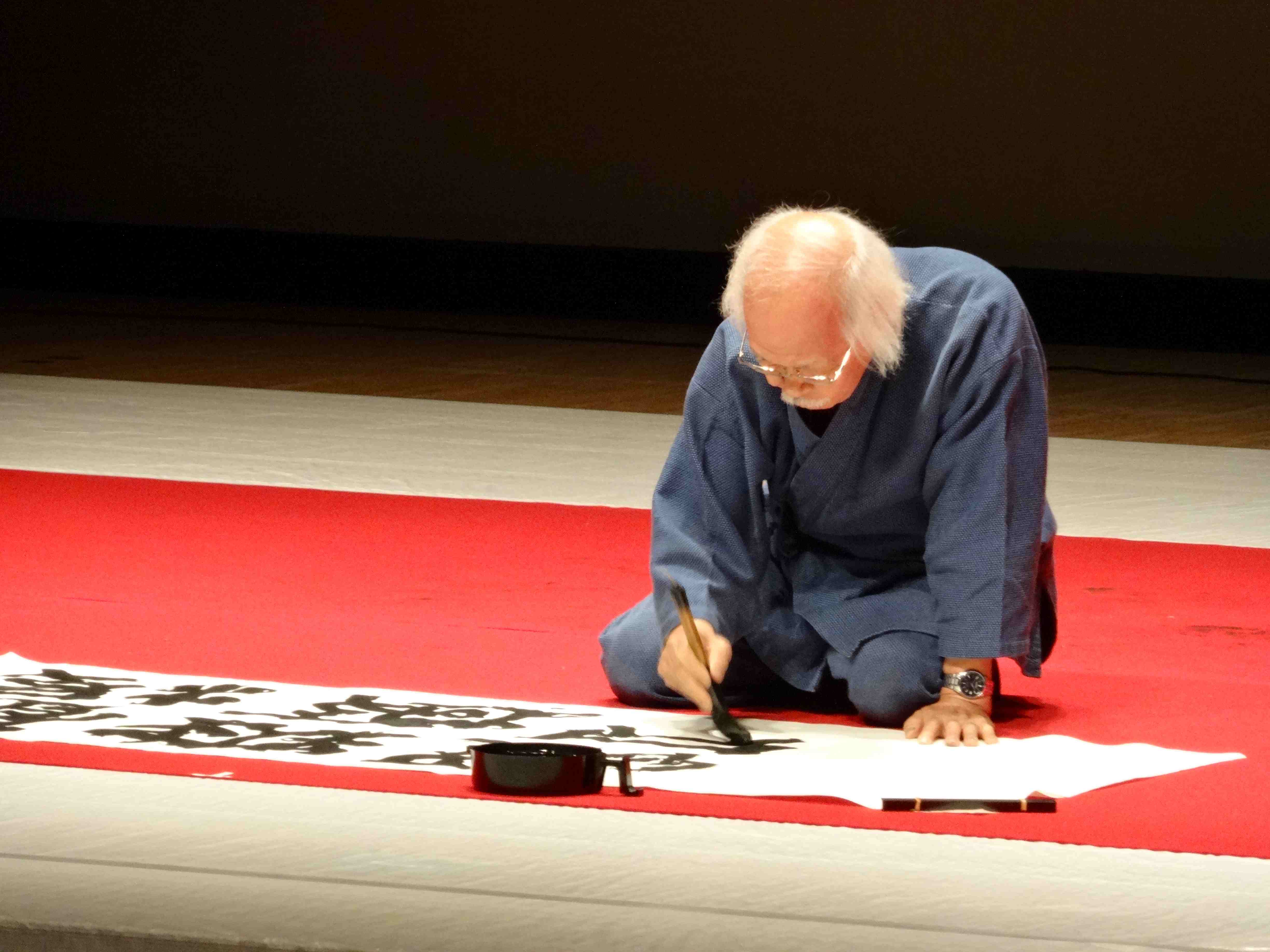 会場に集まった出席者は講話に聞き入るとともに、揮毫の筆遣いなどを熱心に鑑賞していました。
