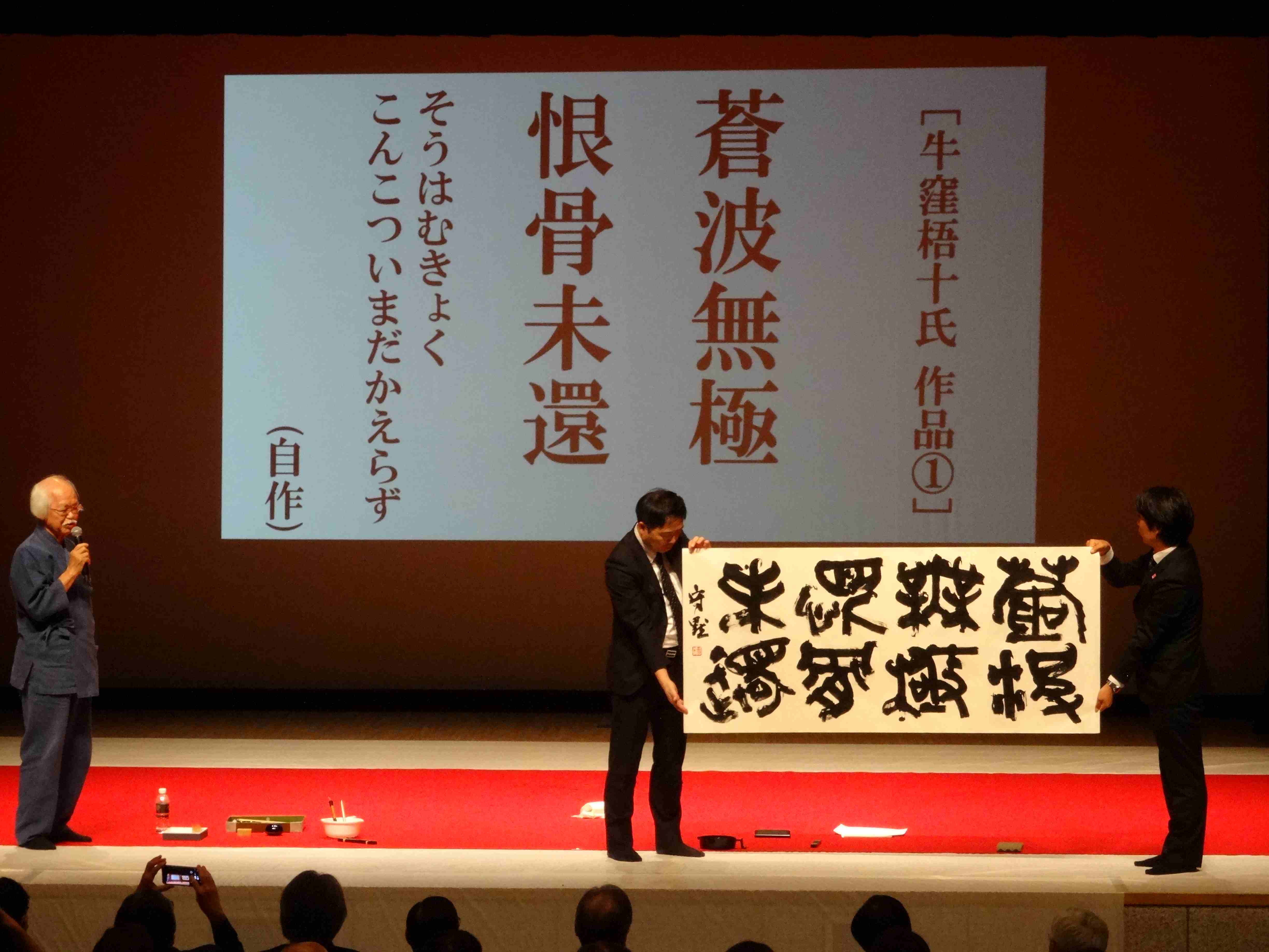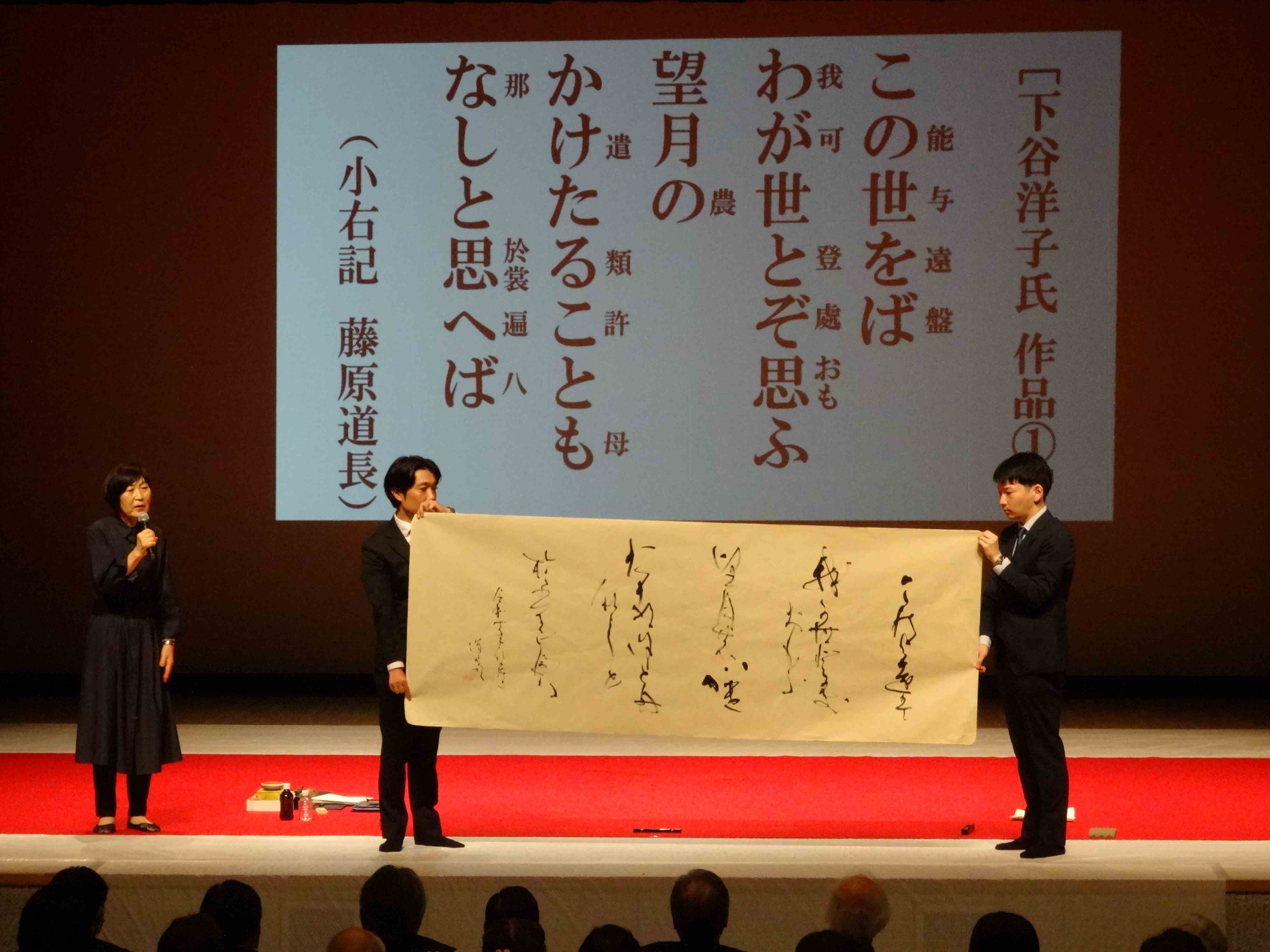 揮毫講師である牛窪梧十先生が漢字1作品と漢字仮名交じり1作品、下谷洋子先生が仮名2作品、山中翠谷先生が漢字2作品を揮毫し、作品や作風の解説を行いました。