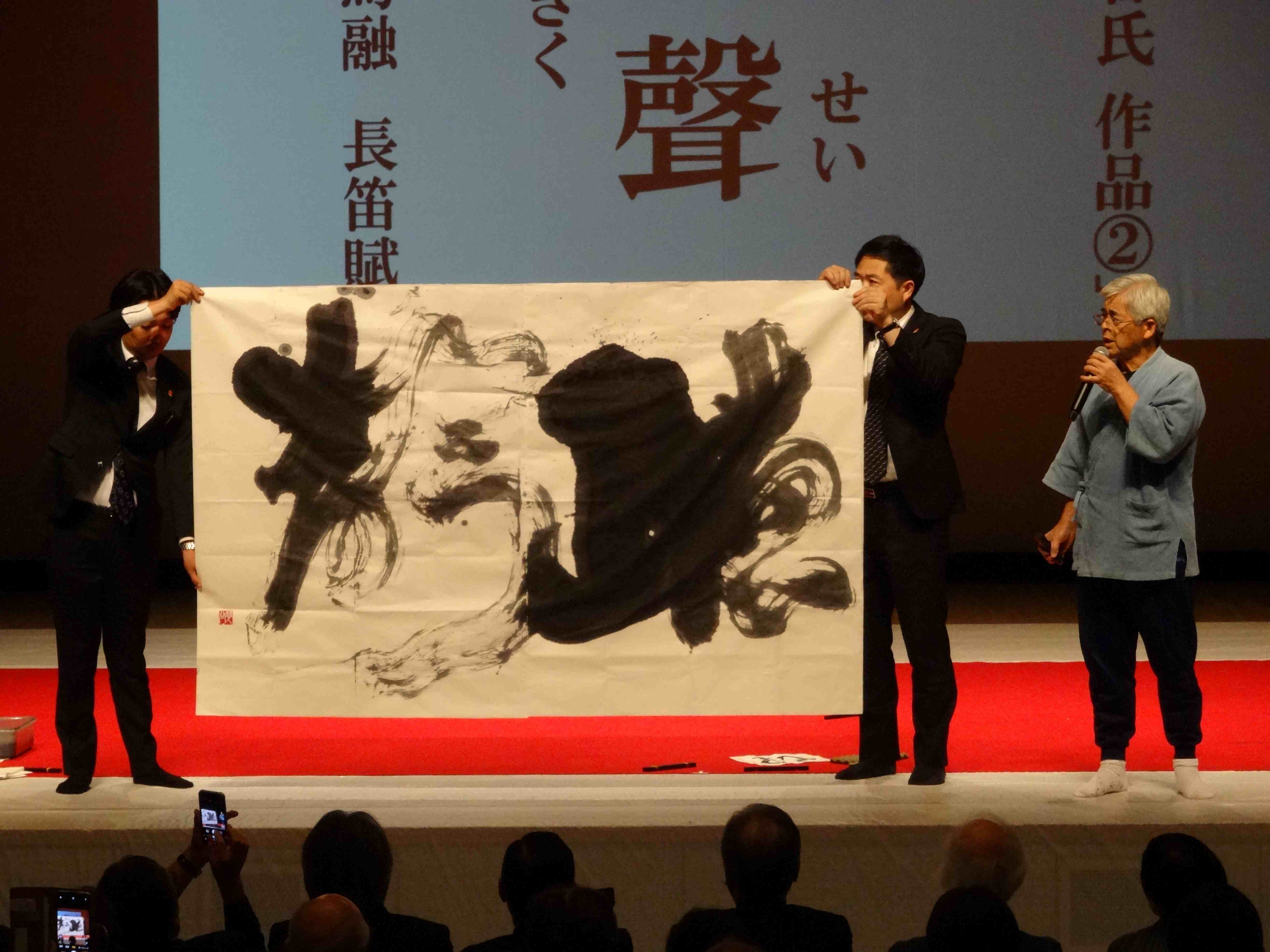 最初に髙木聖雨副会長と田中壮一郎特別顧問から挨拶が行われ、今回の揮毫会が復興支援の一助となることを願っていること、日本書道文化協会の活動やユネスコ無形文化遺産登録に向けた活動などの紹介がありました。その後、約1時間半にわたり、牛窪梧十先生、下谷洋子先生、山中翠谷先生の順に揮毫と講話が行われました。揮毫の先生方は、作品に込められた思いや書道への向き合い方など、大変興味深いお話を含め、作品の解説を行っていただきました。