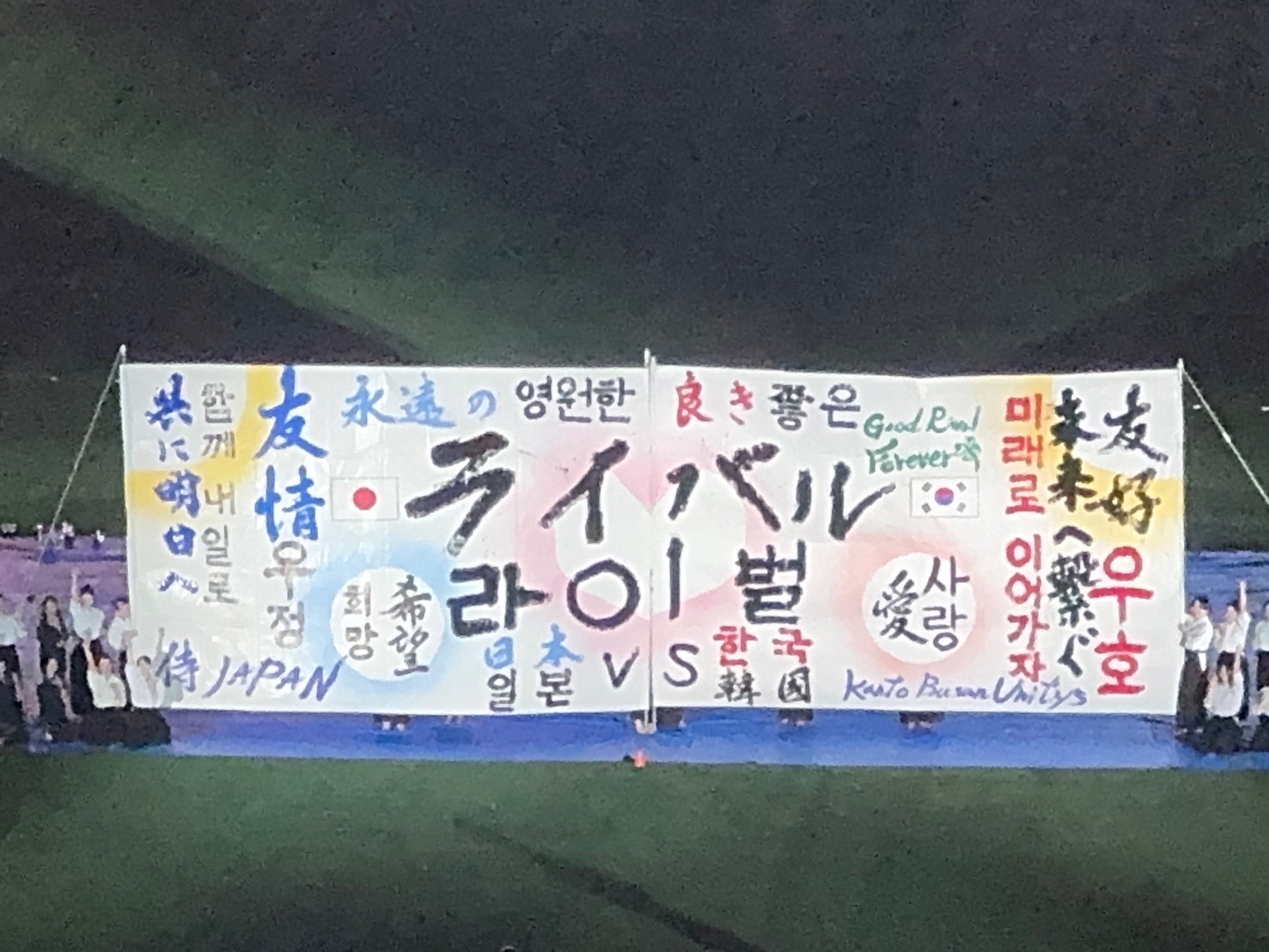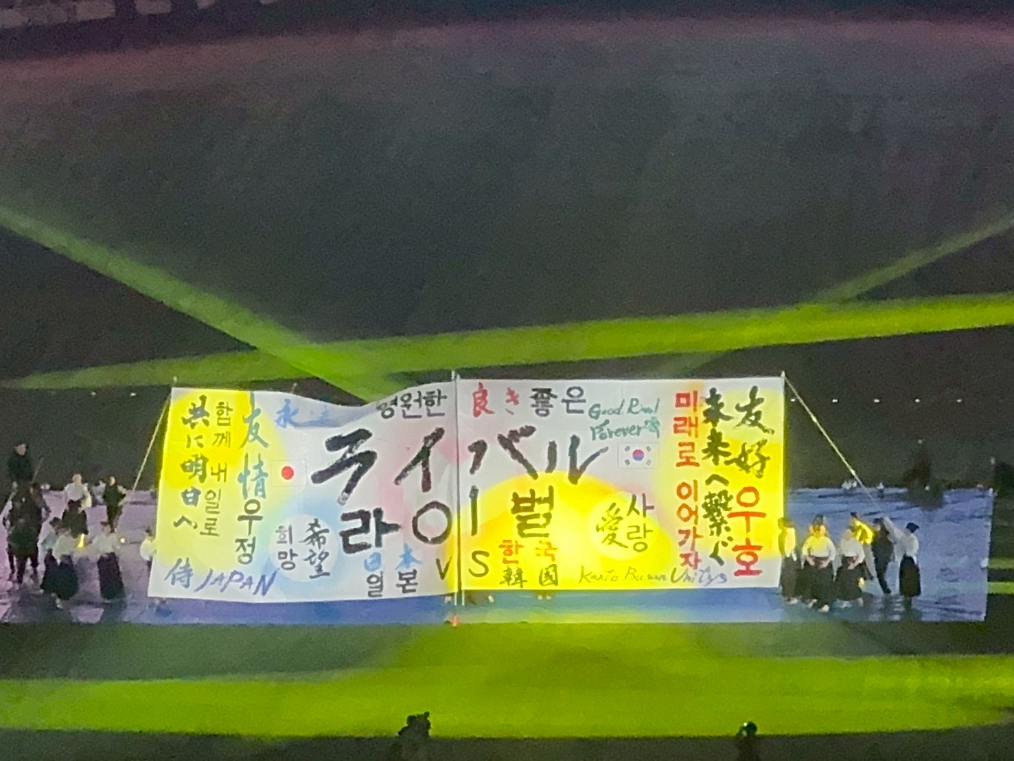 私たちは今年日韓国交正常化60周年という特別な節目の年に韓国釜山を訪れました。そのことがきっかけで伝統の侍JAPAN日韓戦で書道パフォーマンスを行えるという素晴らしい機会を得ることができました。11月15日東京ドームで私たちは「ライバル」でありながら、お互いを尊敬し、友として繋がる想い、「友情」、「青春」、「繋がり」、「友好」をテーマとしたパフォーマンスを行いました。