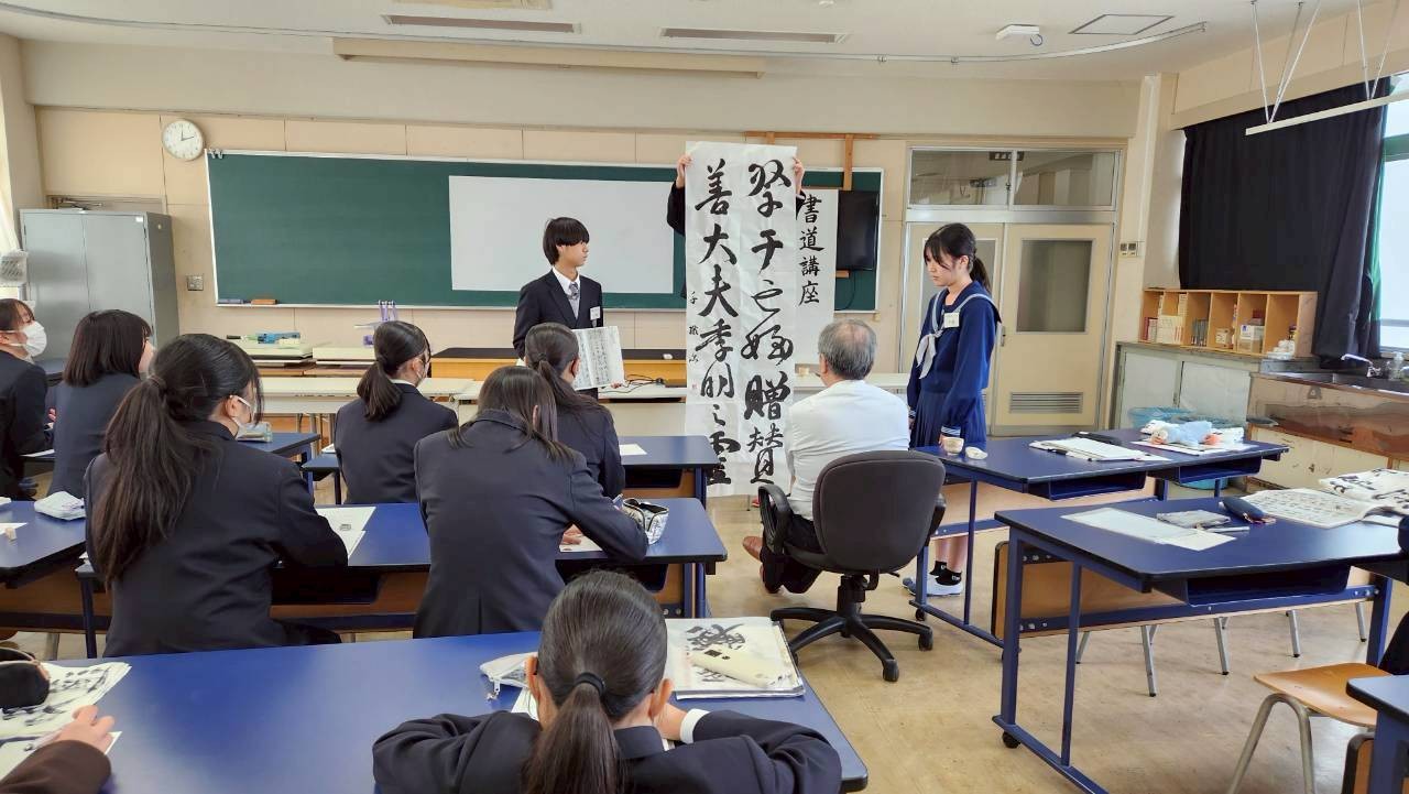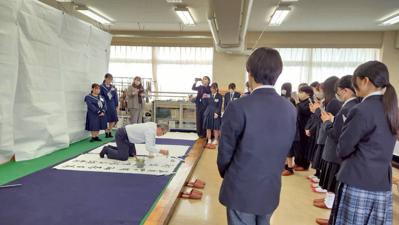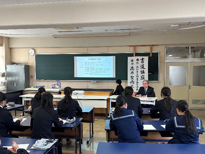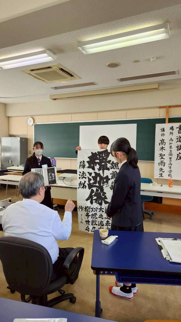 令和7年度2回目の派遣事業として令和7年12月20日(土)に、芸術系の書道コースを設置し多くの書道展で優秀な成績をおさめている高知県立岡豊(おこう)高等学校において、本協会の髙木聖雨副会長を講師に実施いたしました。今回の実施状況について、岡豊高等学校書道部顧問の吉岡久美先生から実施状況の報告とコメント、写真をいただいておりますので、掲載いたします。