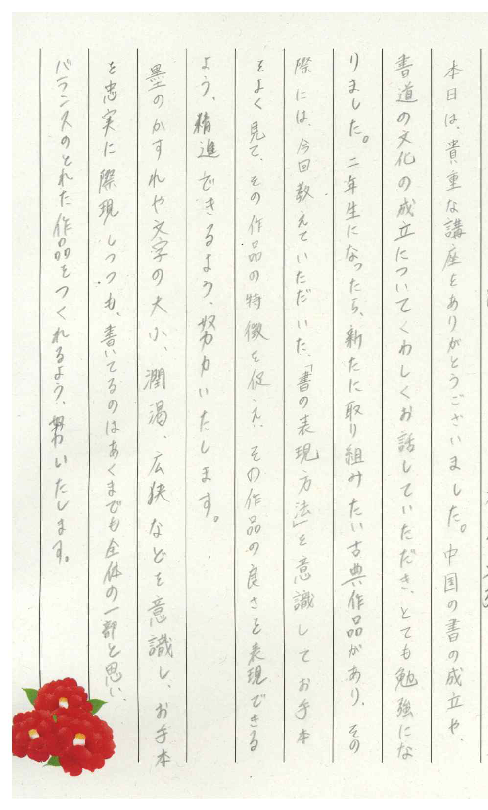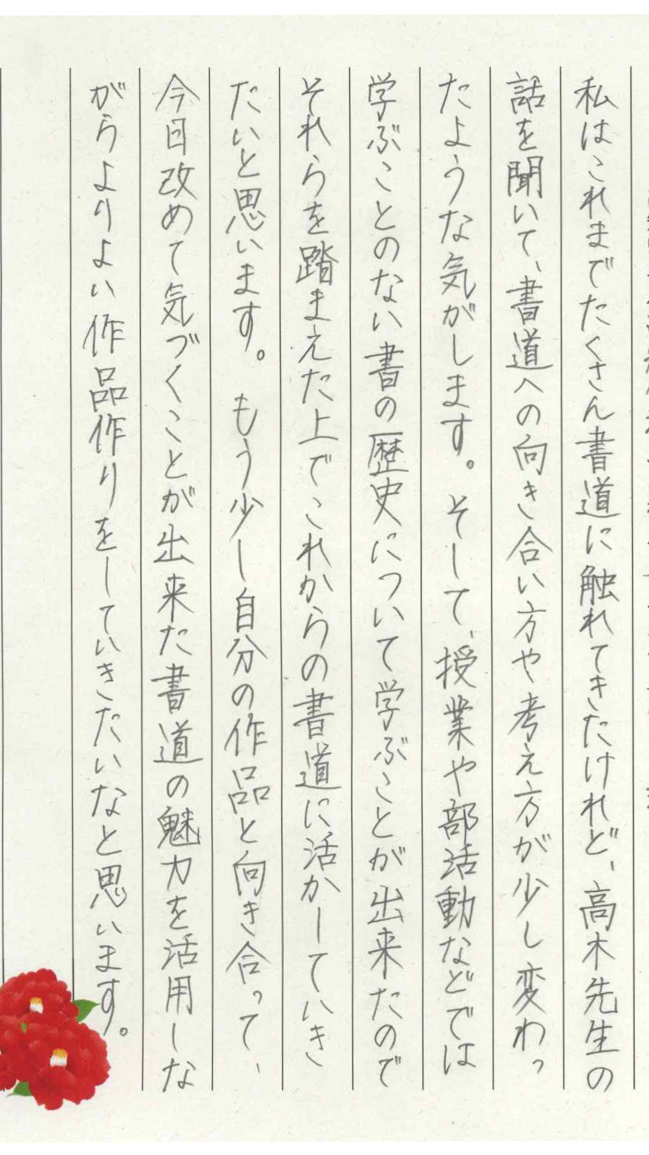 生徒たちの感想からは、新たな気づきと書へ向かう心構え、作品作りへの意欲向上など前向きな感想が聞かれ大変有意義な時間となったことが伺えます。