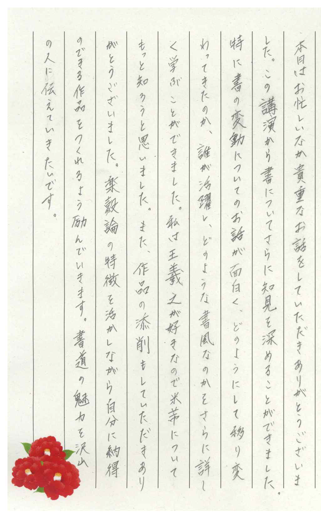 〇今日の書道講座を受講して字を書く楽しさがわかりました。先生はわかりやすい言葉を使って説明してくれたので楽しかったです。先生が300個も印を持っていて最後に印を押す瞬間が好きと言っていたので、私もこれからは印を押す時を大事にしていきたいです。