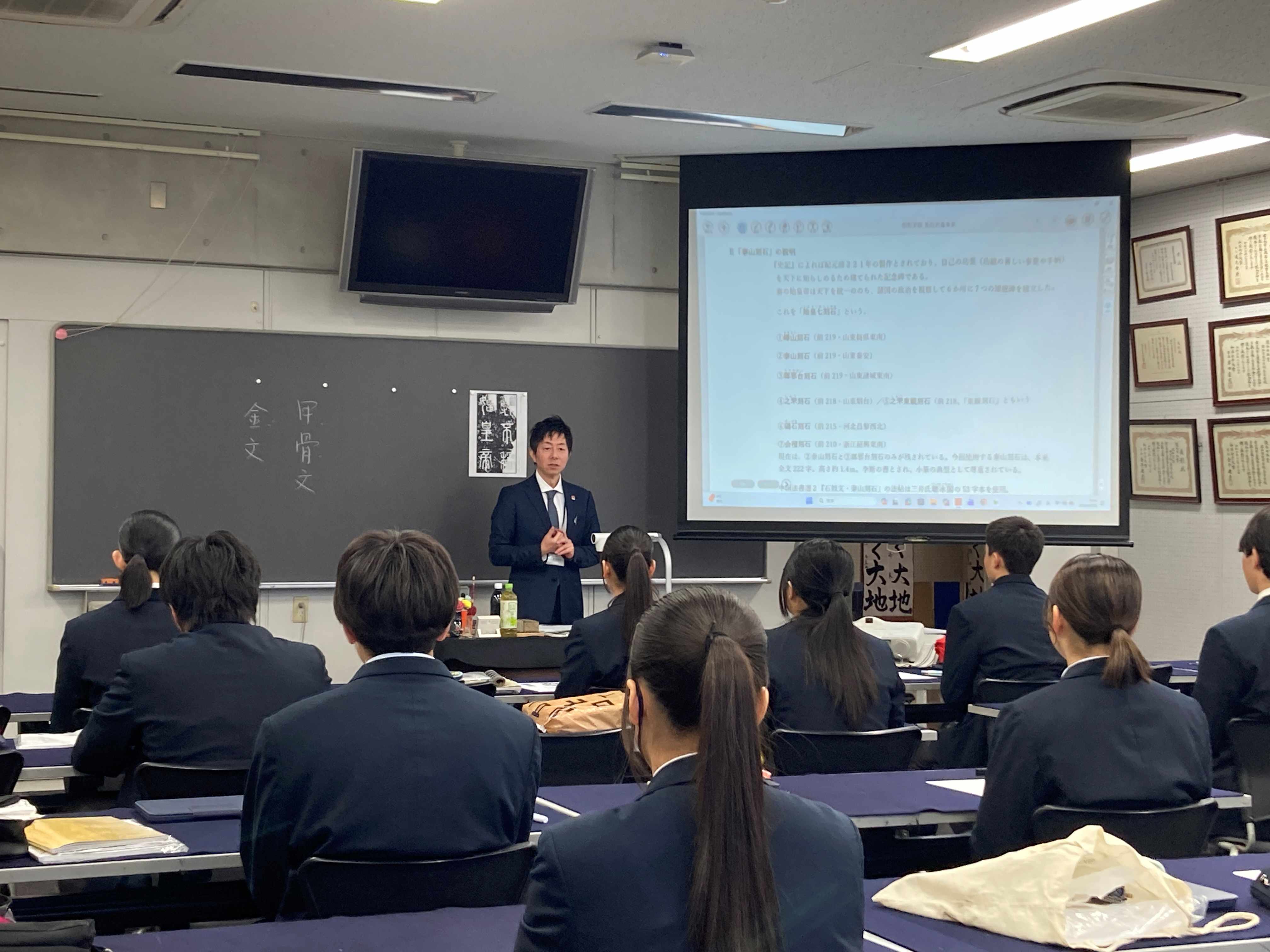 1時間目は、「「泰山刻石」を用いた目習いの学習法」と題して、泰山刻石の説明や、泰山刻石の復元を墨と修正液を使って行う作業学習を実施しました。