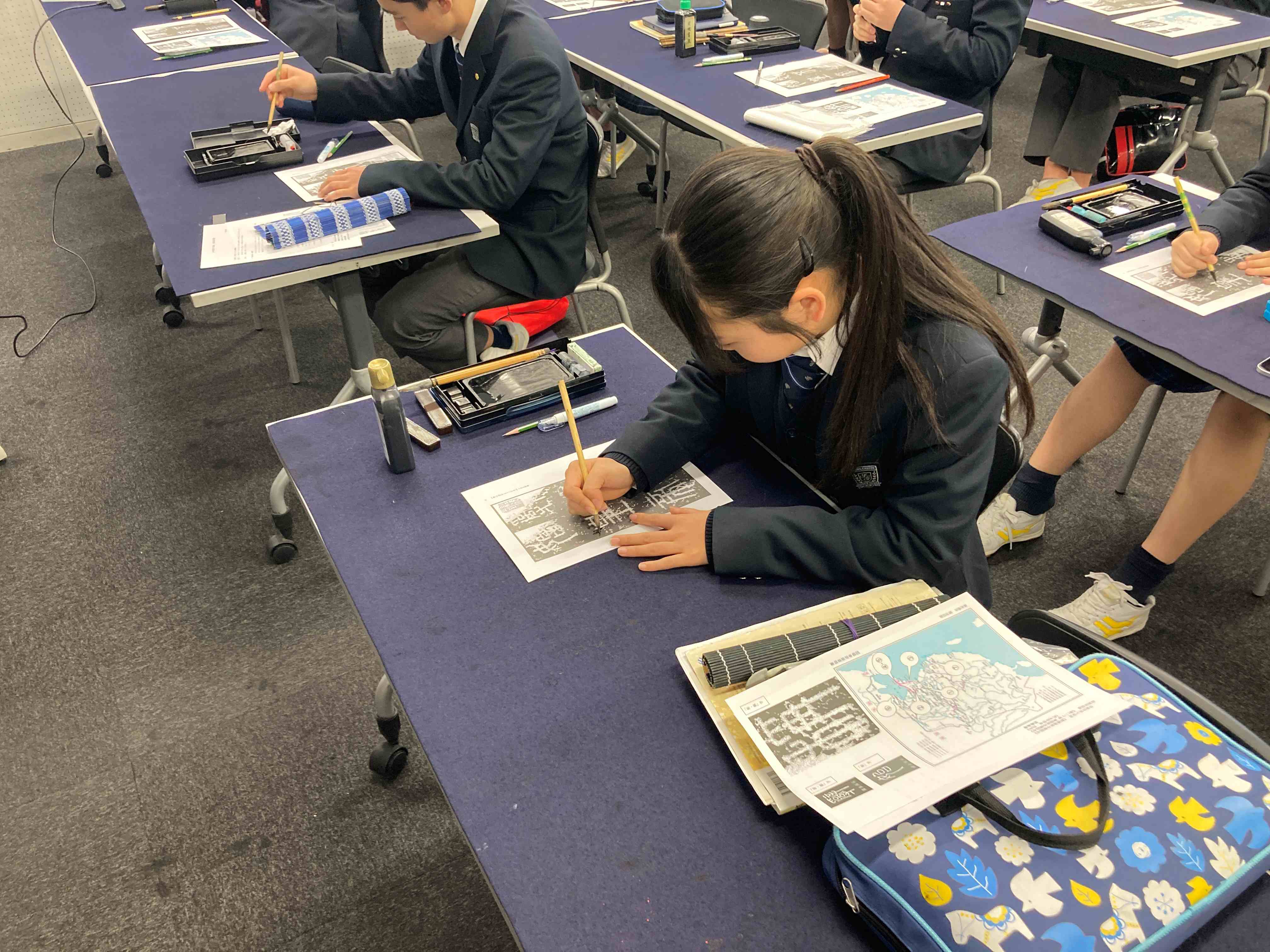 2時間目は、「創作作品の制作方法」と題して、書体の変遷などの説明の後、実際に生徒が作品を書き、講師による添削を受けて完成させる、という実習を行いました。