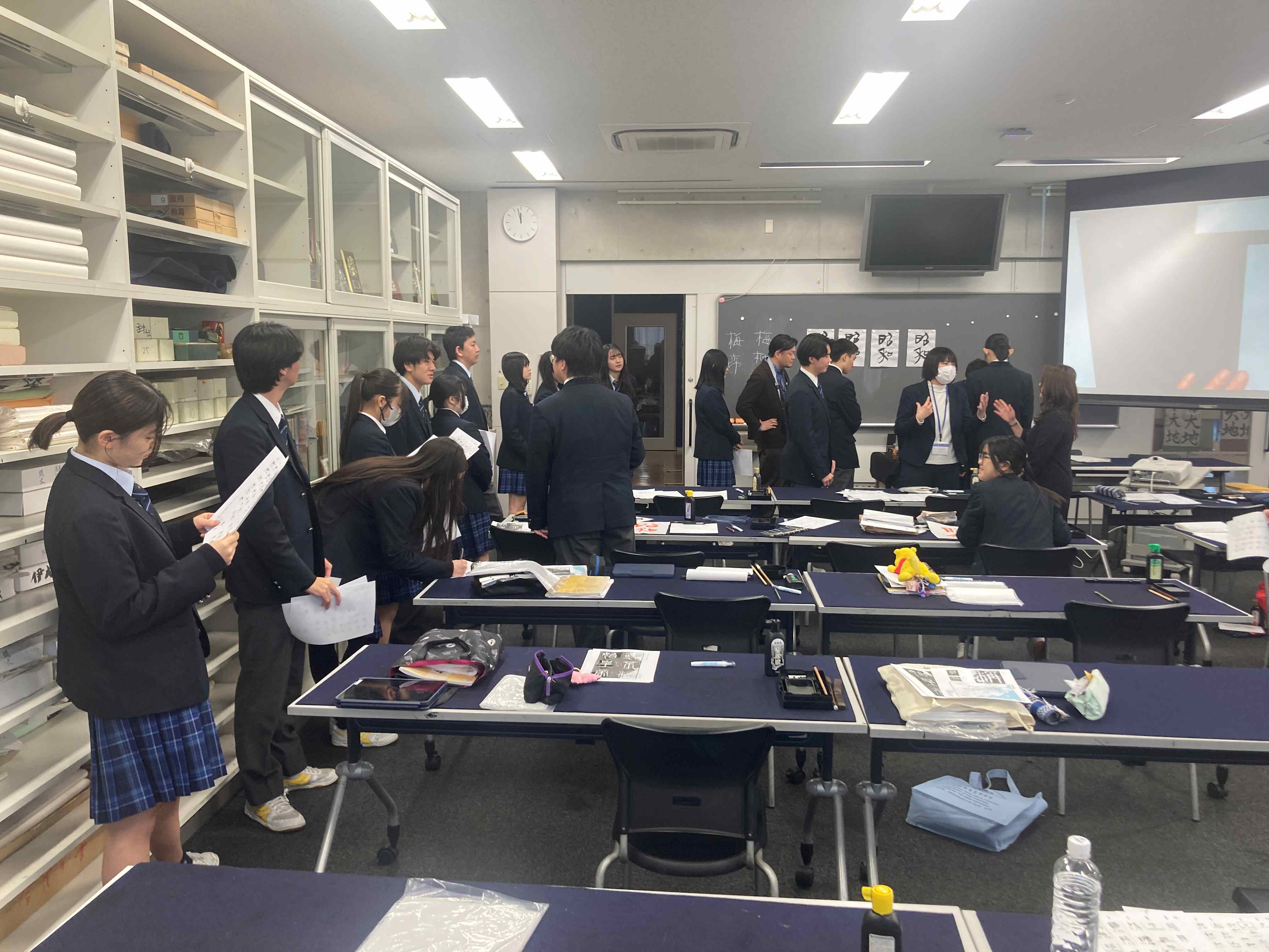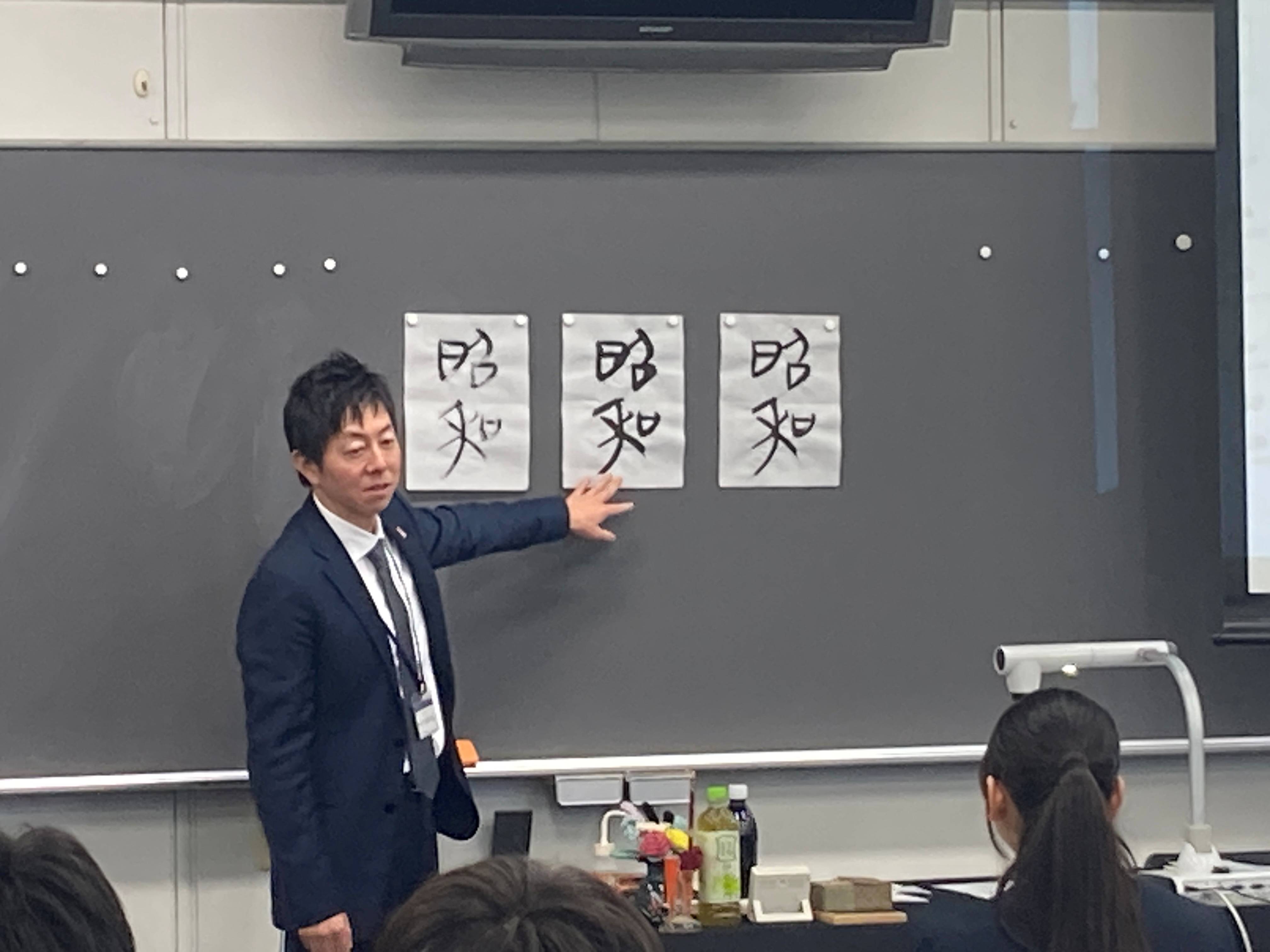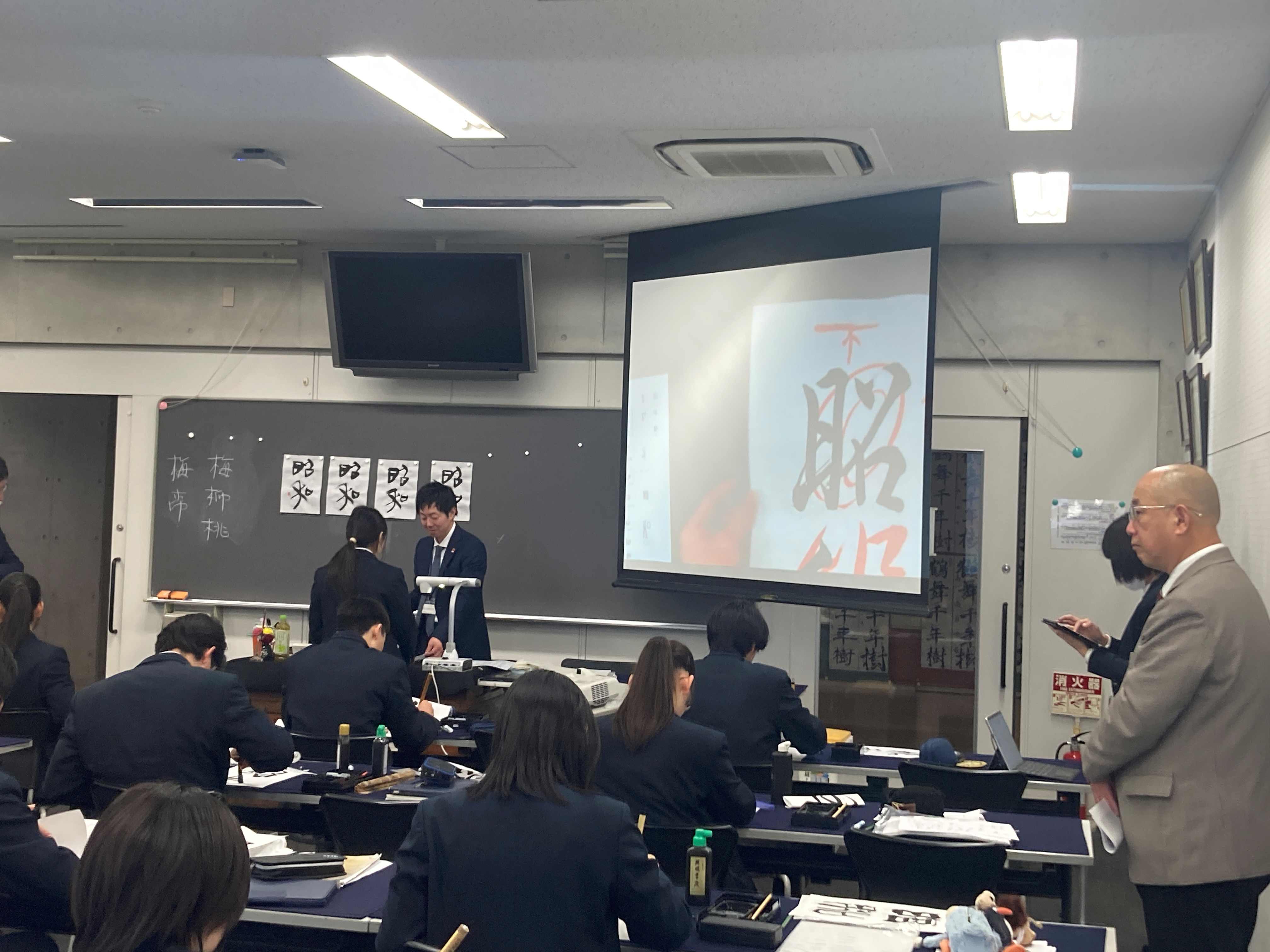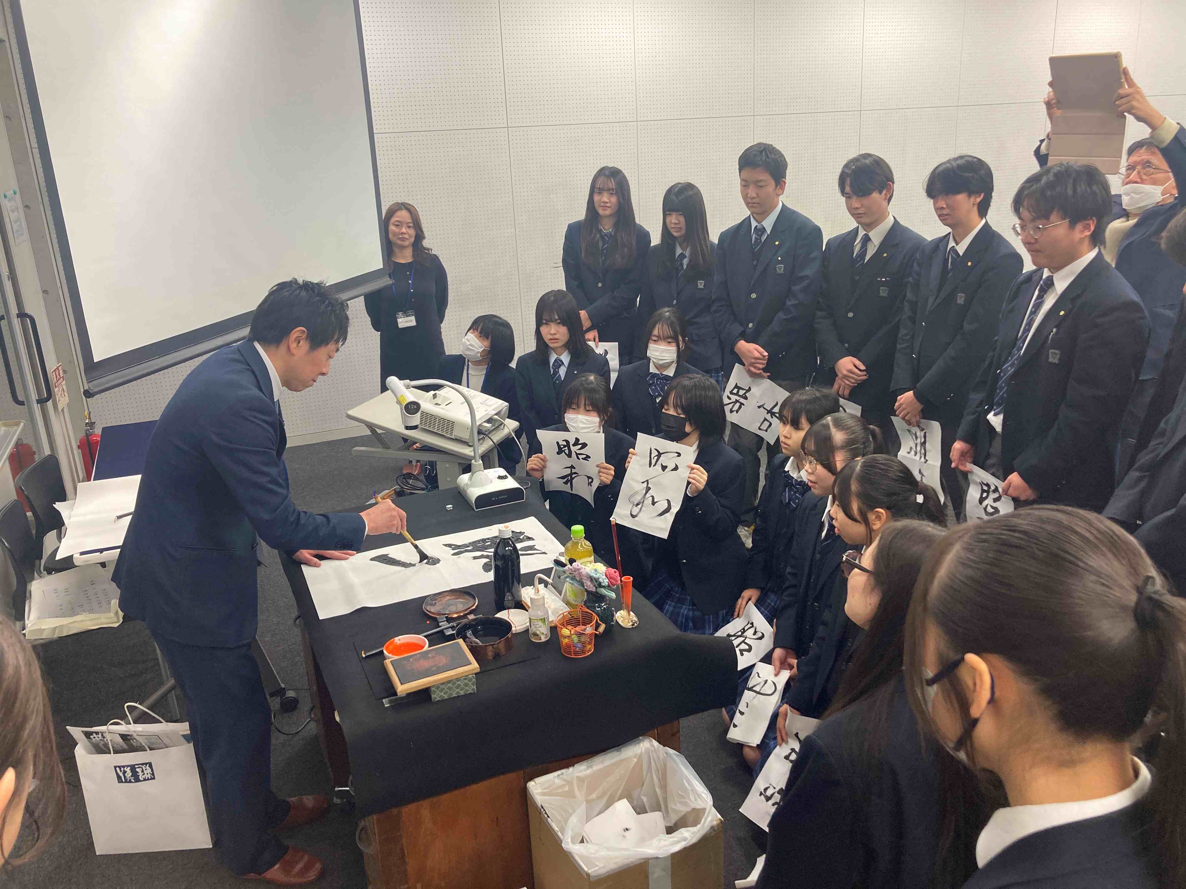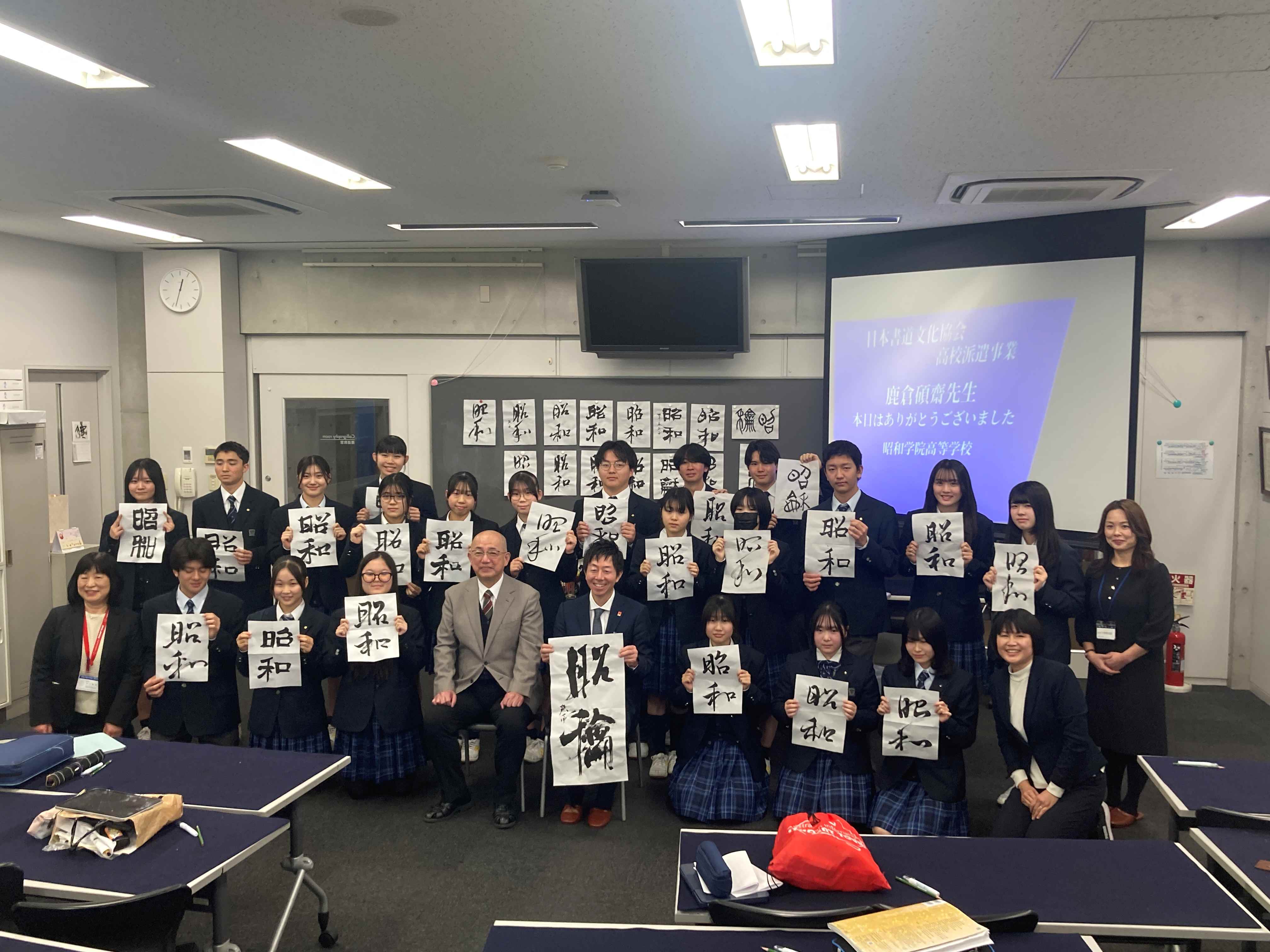 令和8年2月2日(月)に、千葉県私立昭和学院高等学校において、午前中の2時間の授業時間を使って、鹿倉碩齋講師による授業が行われました。参加した生徒は、高校1年生(「書道Ⅰ」選択者)13名(インターナショナルアカデミーコース9名、アドバンストアカデミーコース4名)と書道研究部(1年~3年生)8名の合計21名です。