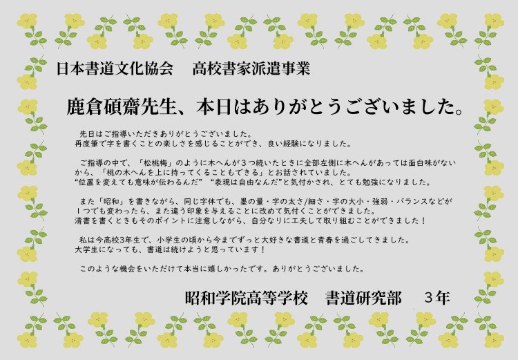 今回の事業の実施に当たっては、昭和学院高等学校の山本良和校長先生、書道科主任の矢口春美先生、副主任の石渕愛美先生に大変ご尽力いただいたことを感謝申し上げます。また、昭和学院高校書道研究部OGである鹿倉講師夫人も生徒への指導に加わっていただき、ありがとうございました。